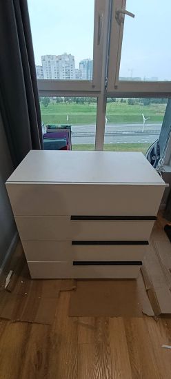 Соберём комод по инструкции изготовителя и установим в нужном месте. Работу выполним за 1–2 часа. Будет шумно.