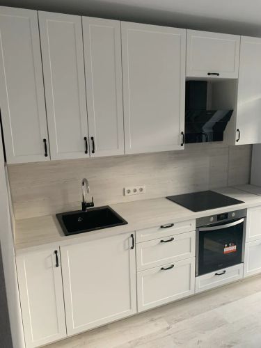 Соберём каркасы, навесим шкафы, дверцы и фурнитуру. Всё отрегулируем. Установим, мойку с сифоном и смесителем.
