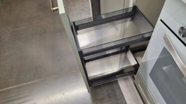 Если кухня проектная, установим плинтус, цоколь, фартук или фальшпанель, барную стойку, рейлинг, сушку и выдвижные корзины. Сделаем все технические вырезы под мойку, смеситель, трубы и технику.